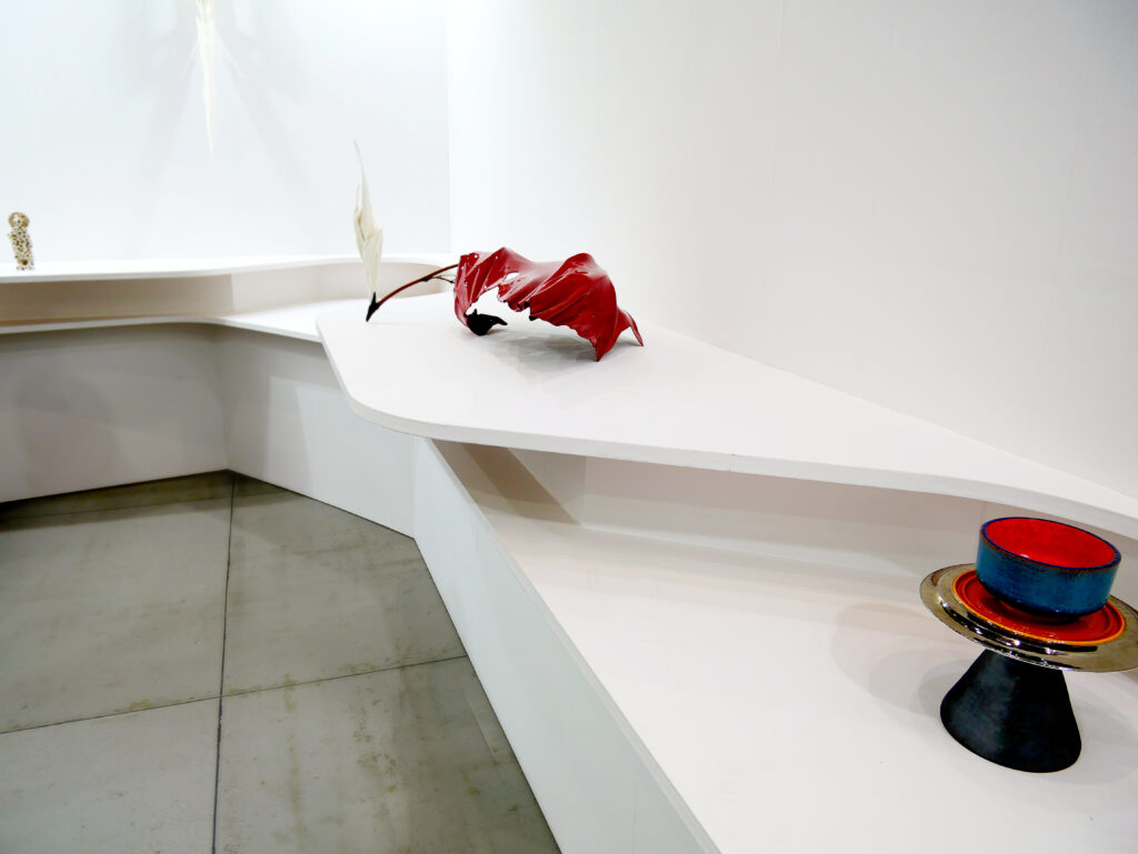 2018年東京国際アートフェア(AFT)におけるSokyoのギャラリーブース。現代陶芸作品を展示するために、連続した2層構造の波打つカウンターが特徴的なデザインです。